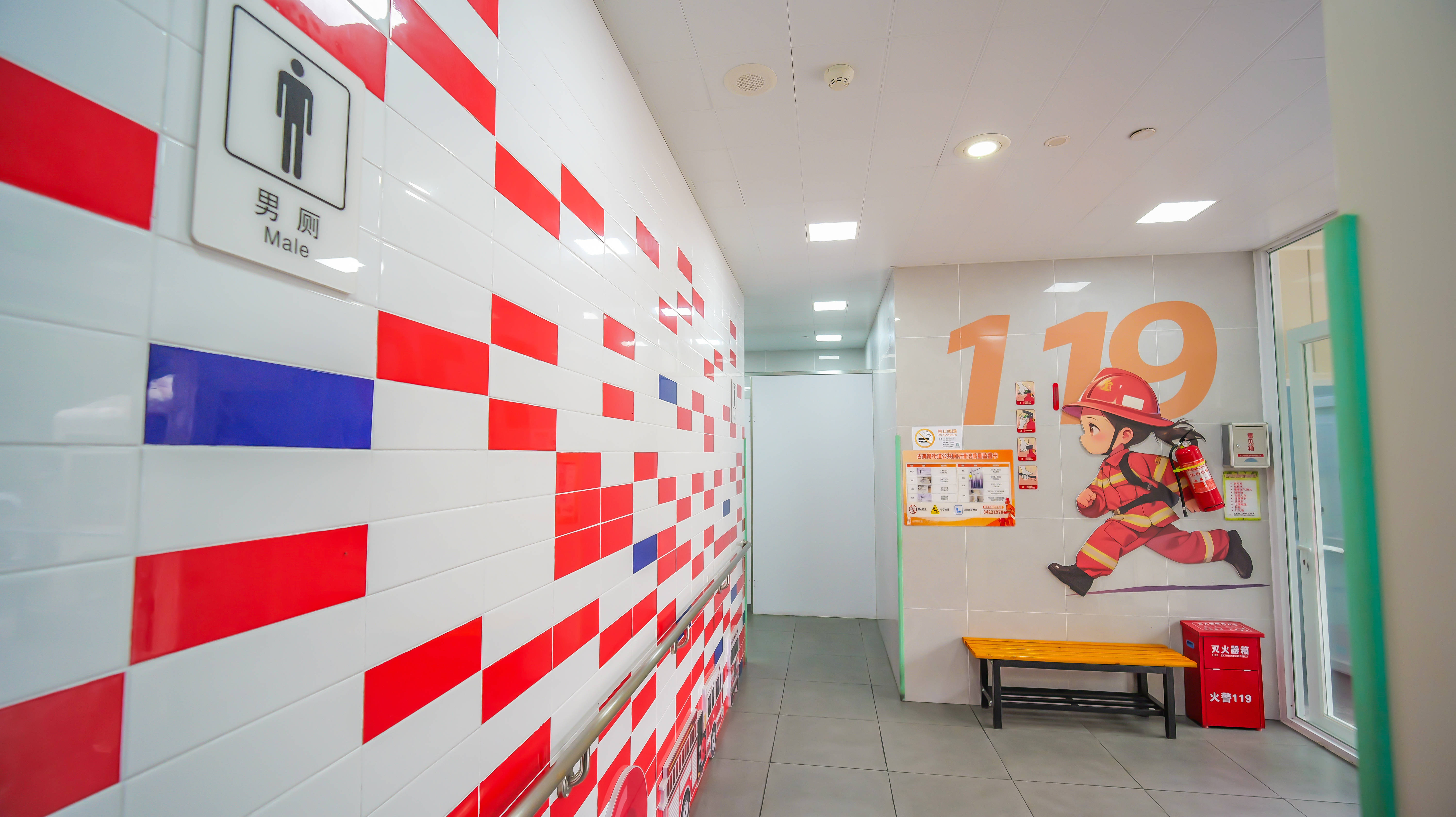 这是万源城公厕的装饰,以消防安全为主题。新华社发智慧管理、自动化无人保洁与智能除臭等智慧和节能技术应用层出不穷。世纪公园7号门公厕引入物联网技术,实现远程控制、安全监测等功能。“悦薇驿”公厕采用再生木材与环保涂料,其引入的节水装置可省水30%。淮海中路918号公厕还增设了“搁物架遗留提醒”功能。